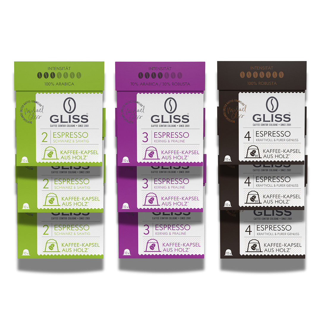 Im „Espresso Express„ Deluxe Paket findest du 90 hölzerne Kapseln mit feinstem Gliss Kaffee.